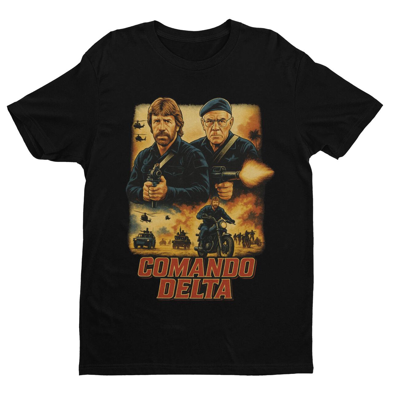 Se a sua ideia de um resgate tático perfeito envolve o Major Scott McCoy saltando pela janela com uma submetralhadora em cada mão, você acaba de encontrar a sua farda. Esta estampa é uma homenagem explosiva a Comando Delta (The Delta Force), o clássico absoluto que definiu o cinema de ação de 1986.