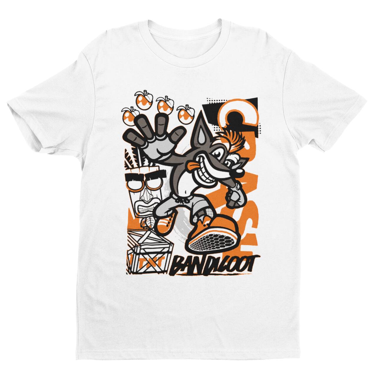 O design é uma explosão de nostalgia laranja: Crash em seu salto clássico com a língua de fora, cercado por tudo o que importa na vida de um bandicoot — as deliciosas Wumpa Fruits, as perigosas caixas de TNT e, claro, a proteção mística da máscara Aku Aku. O estilo gráfico dinâmico, em preto, branco e laranja, captura perfeitamente a atitude “radical” que definiu a era do primeiro PlayStation.