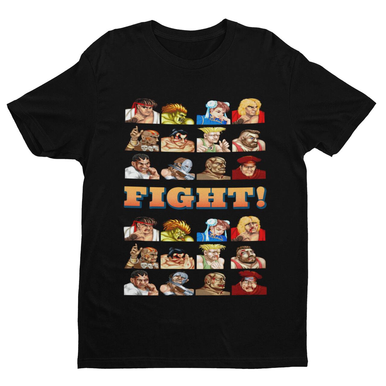 O design genial exibe os 12 lutadores clássicos da era Champion Edition (incluindo os chefões da Shadaloo). Na parte superior, os retratos imaculados e heroicos da tela de seleção. Separados pelo icônico “FIGHT!”, a metade inferior revela a dura realidade dos arcades: os rostos machucados, inchados e derrotados da inesquecível tela de “Game Over”. É a glória e a dor dos 16-bits estampadas no peito.