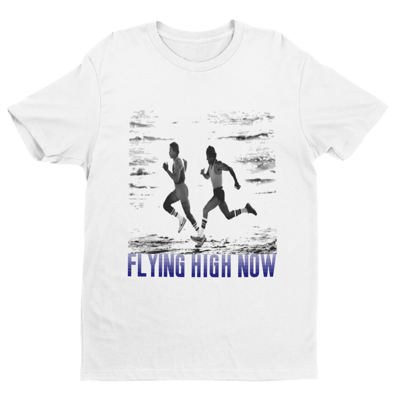 O design aposta na nostalgia com uma fotografia clássica em preto e branco da corrida, contrastando com a tipografia “FLYING HIGH NOW” em um gradiente azul metálico que grita anos 80. É a celebração da amizade que nasceu da rivalidade e do instante em que Rocky reencontrou o “Olho do Tigre”.