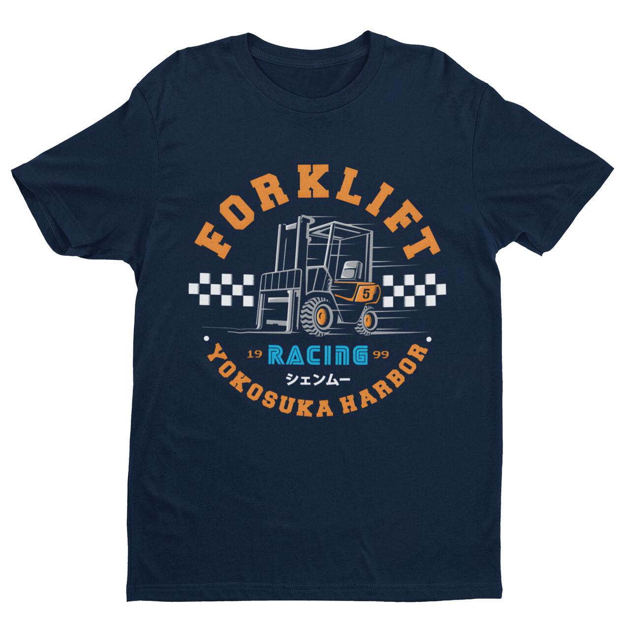 O design aposta em uma estética brilhante de logotipo de oficina mecânica ou “motor club” vintage. No centro, a lendária Empilhadeira Número 5 (dirigida por Ryo Hazuki) cruza a pista a toda velocidade, ladeada pela clássica bandeira quadriculada. A arte coroa a nostalgia com o ano de lançamento do jogo (1999), o nome do inesquecível porto de Yokosuka e os katakanas originais do título (シェンムー) no centro.