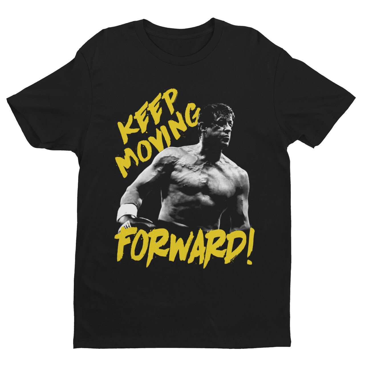 Esta peça captura a forma física inacreditável de Rocky em 2006, durante sua preparação brutal para a luta contra Mason Dixon. A arte em alto contraste exibe cada veia e cada músculo conquistado com pura força de vontade, coroada pela frase em amarelo vibrante “KEEP MOVING FORWARD!” — o conselho de pai que se tornou o lema de uma geração.
