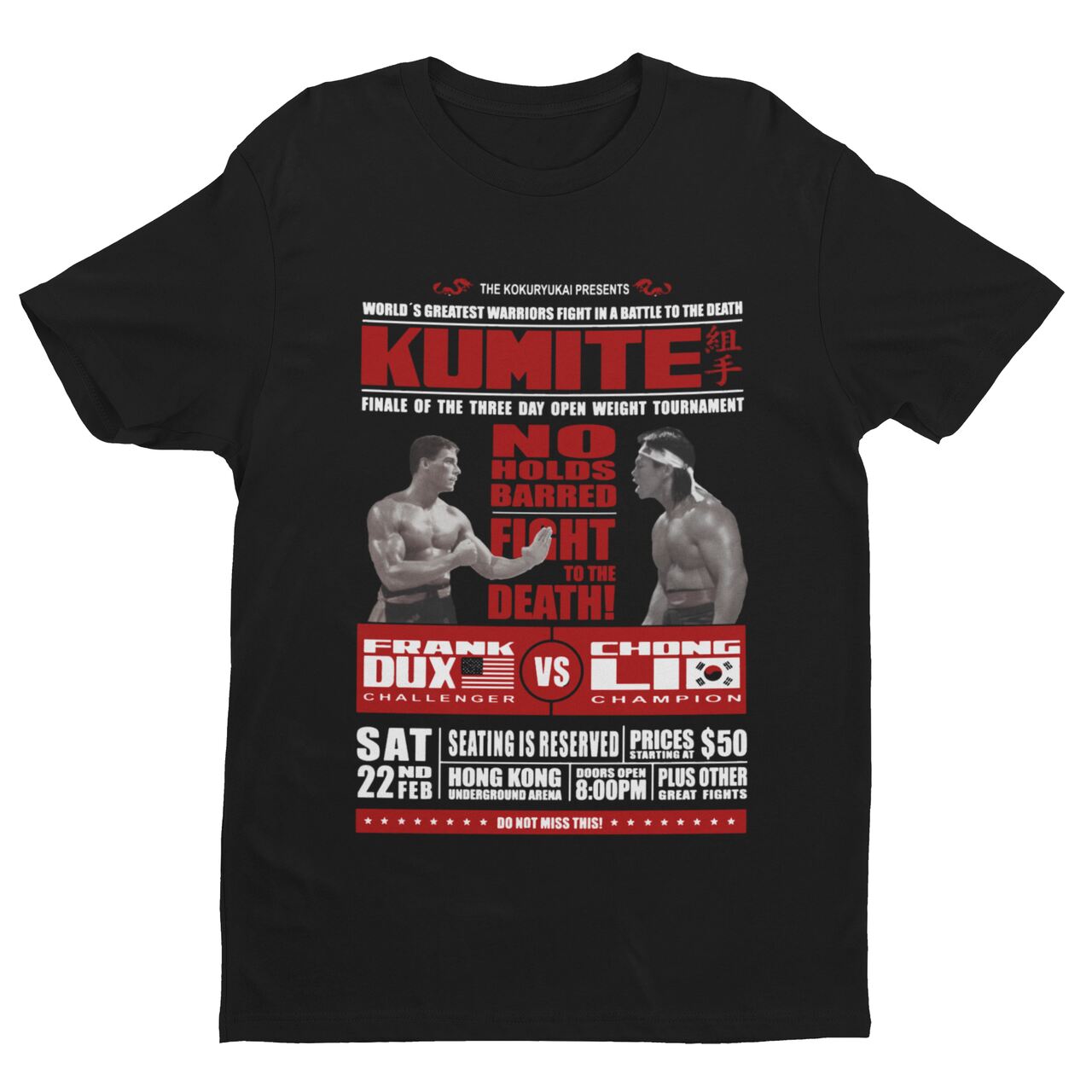 O design simula um cartaz promocional do evento final, colocando frente a frente a técnica do desafiante americano Frank Dux (Jean-Claude Van Damme) e a fúria assassina do campeão Chong Li (Bolo Yeung). Repleta de detalhes que todo fã ama — como a data (22 de Fevereiro), o local secreto e o aviso de “No Holds Barred / Fight to the Death” — esta peça é uma homenagem ao filme que ensinou uma geração inteira a fazer abertura zero.