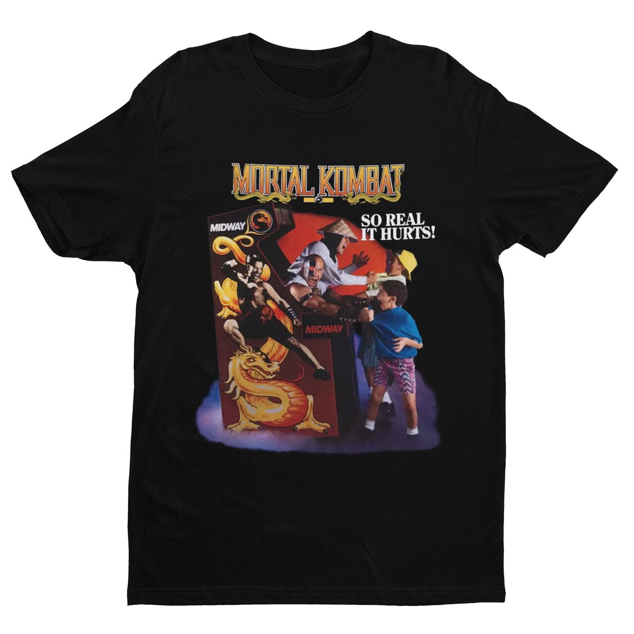 O design é puro suco dos anos 90: a icônica máquina da Midway, com o dragão clássico estampado na lateral, literalmente explodindo para o mundo real. A arte traz os atores digitalizados originais de Kano e Raiden saltando da tela para agarrar a molecada, ilustrando de forma genial o inesquecível slogan “SO REAL IT HURTS!” (Tão real que machuca!). É um pedaço inestimável da história da cultura pop estampado em tecido.
