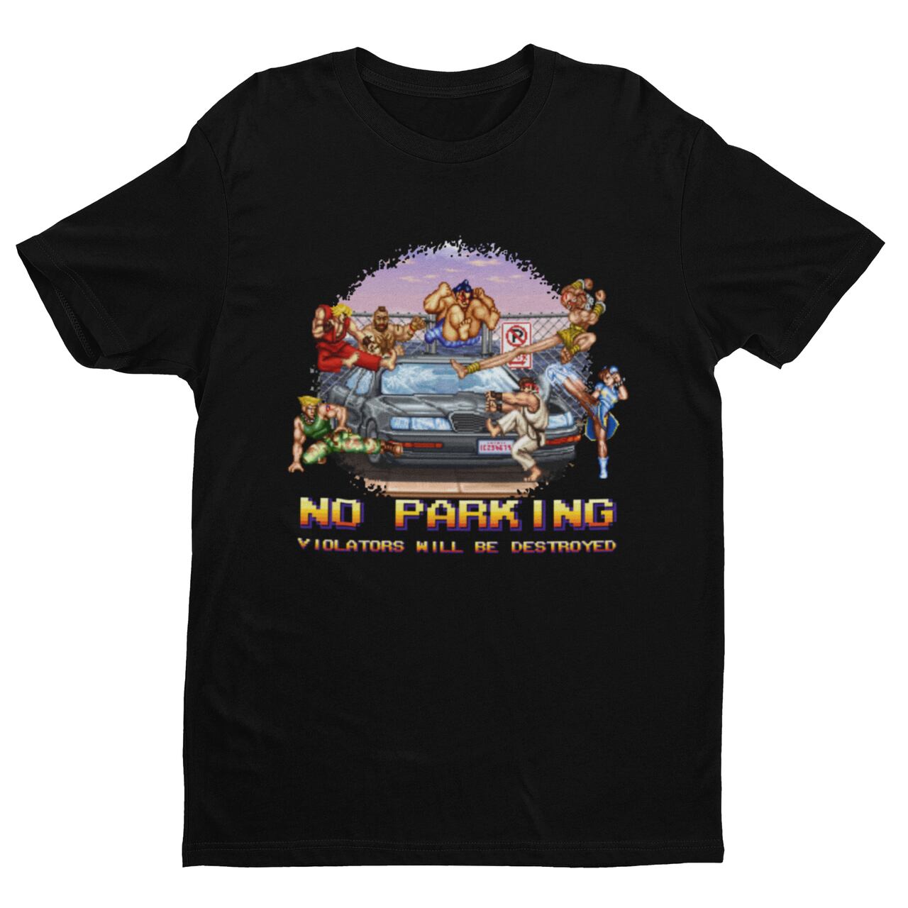 O design é uma verdadeira obra-prima em pixel art, reunindo os oito World Warriors originais em um esforço conjunto e hilário para obliterar o veículo. Ryu, Ken, Chun-Li, Guile, Zangief, Dhalsim, e E. Honda aparecem aplicando seus golpes característicos simultaneamente. Para coroar a arte, a frase “NO PARKING – VIOLATORS WILL BE DESTROYED” (Proibido Estacionar – Infratores serão destruídos) em fonte clássica de arcade fecha a piada com perfeição.