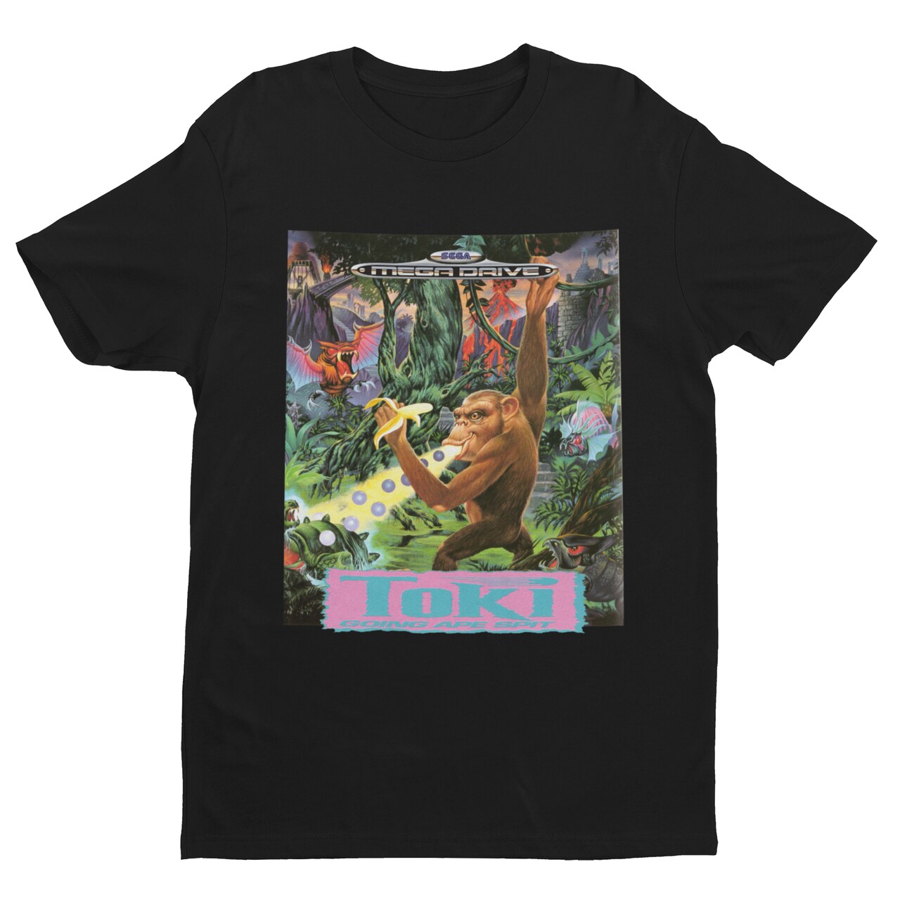 O design reproduz fielmente a arte inesquecível da versão do console de 16-bits da SEGA. No centro da selva selvagem, Toki aparece pendurado em um cipó, segurando uma banana e disparando suas famosas esferas de energia pela boca contra as bizarrices jurássicas e demônios alados do feiticeiro Vookimedlo. É o puro caos criativo que a gente amava alugar no fim de semana.